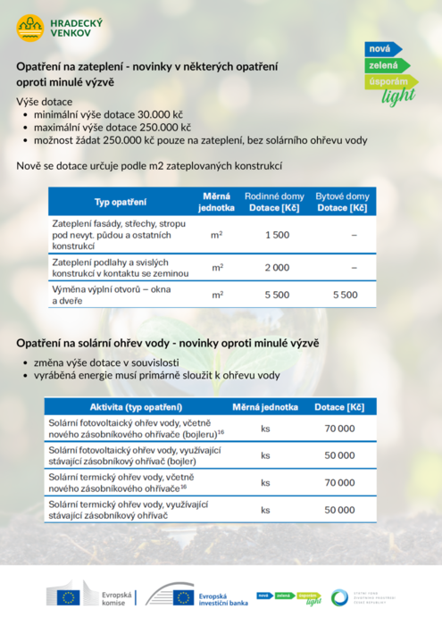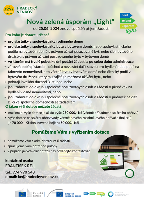 Od 25. 6. 2024 je znovu otevřen program Nová zelená úsporám Light. Pro zájemce o pomoc jsou vám k dispozici v Hradeckém venkově o. p. s., viz příloha.