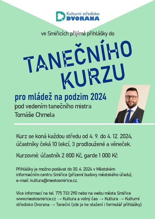 KS Dvorana ve Smiřicích přijímá přihlášky do tanečního kurzu pro mládež na podzim 2024 pod vedením tanečního mistra Tomáše Chmela. Kurz se koná každou středu od 4.9.2024 do 4.12.2024, účastníky čeká 10 lekcí, 3 prodloužené a 1 věneček. Kurzovné je 2800 Kč, garde 1000 Kč. Přihlášky je možné odevzdat do 30.6.2024 v Městském informačním centru Smiřice (přízemí budovy městského úřadu), e-mail kultura@mestosmirice.cz . Více info na tel. 775733290 nebo na webu www.mestosmirice.cz - Kultura a volný čas - Kultura - Kulturní středisko Dvorana - Taneční (zde je ke stažení i formulář přihlášky).