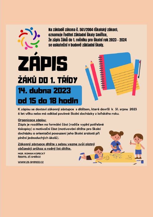 Na základě zákona č. 561/2004 (školský zákon), oznamuje ředitel Základní školy Smiřice, že zápis žáků do 1.ročníku pro školní rok 2023 - 2024 se uskuteční v budově základní školy dne 14. dubna 2023 od 15 do 18 hodin.